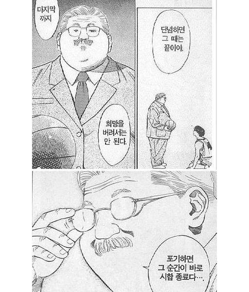 북산고교 농구부 감독 안선생님(안자이센세 본명 안한수)이 중학 농구대회 결승전에서 시간이 얼마남지않아 시합을 포기하려는 정대만에게 하는 대사. 이 말에 용기를 얻은 정대만은 포기하지않고 시합에서 승리하여 팀을 우승으로 이끌고 중학MVP가 된다.